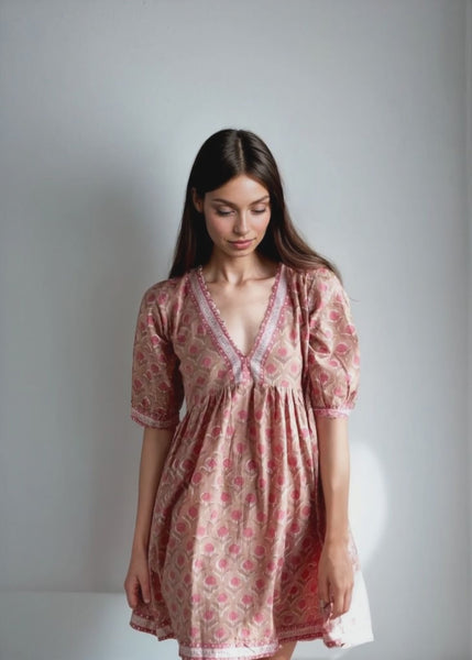 This charming floral mini dress is your new go-to for breezy vacations and effortless style. Hand block-printed by skilled artisans in Bagru, India, each piece is a work of art crafted with care. The soft 100% cotton fabric is lightweight and breathable, with a stunning contrast border that adds a touch of elegance.